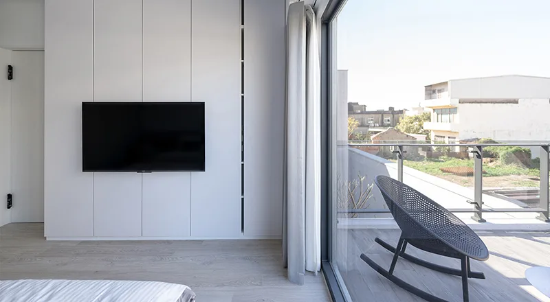 串聯一家人的是中庭內的雞蛋樹,隨著四季更迭、日曬角度伴隨著落葉、嫩芽、開花帶給兩代一家人的共同記憶。聯繫著不只是不同高低一、二樓的陽台露臺和合院的垂直互動,更是偶爾聽見父母的聊天聲音和年輕夫妻的輕聲問候,我們創造的不只是空間、視野、聲音的交織,更是家人情感的流動。讓空間變得感性,自然的光線和空氣以及植栽的搖曳光影,在起風的城市裡微風藉由起風面的東西側帶入。